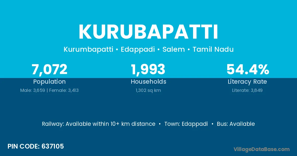 Kurubapatti village has a total population of 7,072 people, of which 3,659 are males and 3,413 are females.