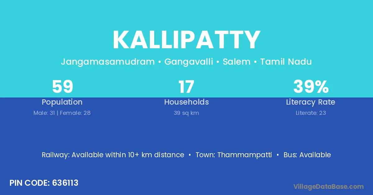 The literacy rate of Kallipatty village is 38.98%. Male literacy stands at 64.52% and female literacy at 10.71%.