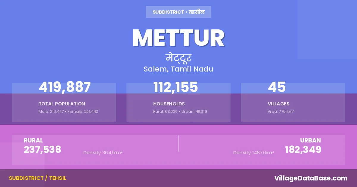According to the 2011 census The total area of Mettur Taluka is 775 km², with a population of 419887 people. The population density is 542 inhabitants per square kilometre, and there are approximately 112155 houses in the sub district.
