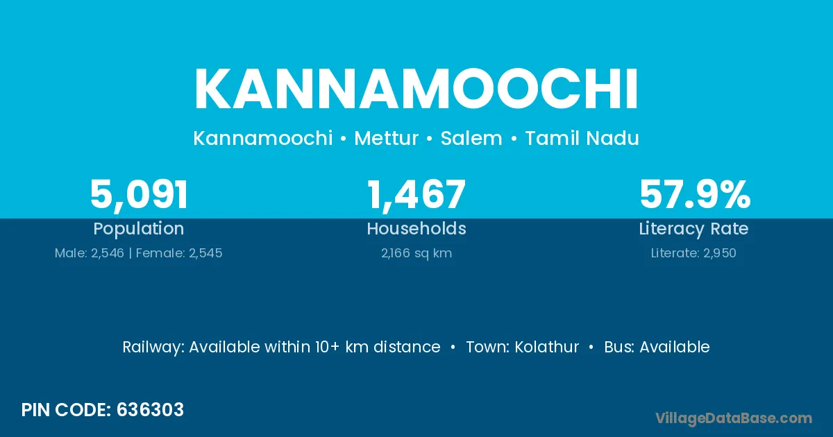 Kannamoochi village has a total population of 5,091 people, of which 2,546 are males and 2,545 are females.