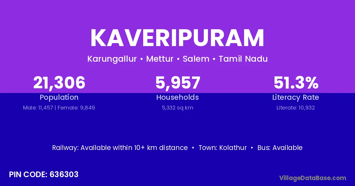Kaveripuram village has a total population of 21,306 people, of which 11,457 are males and 9,849 are females.