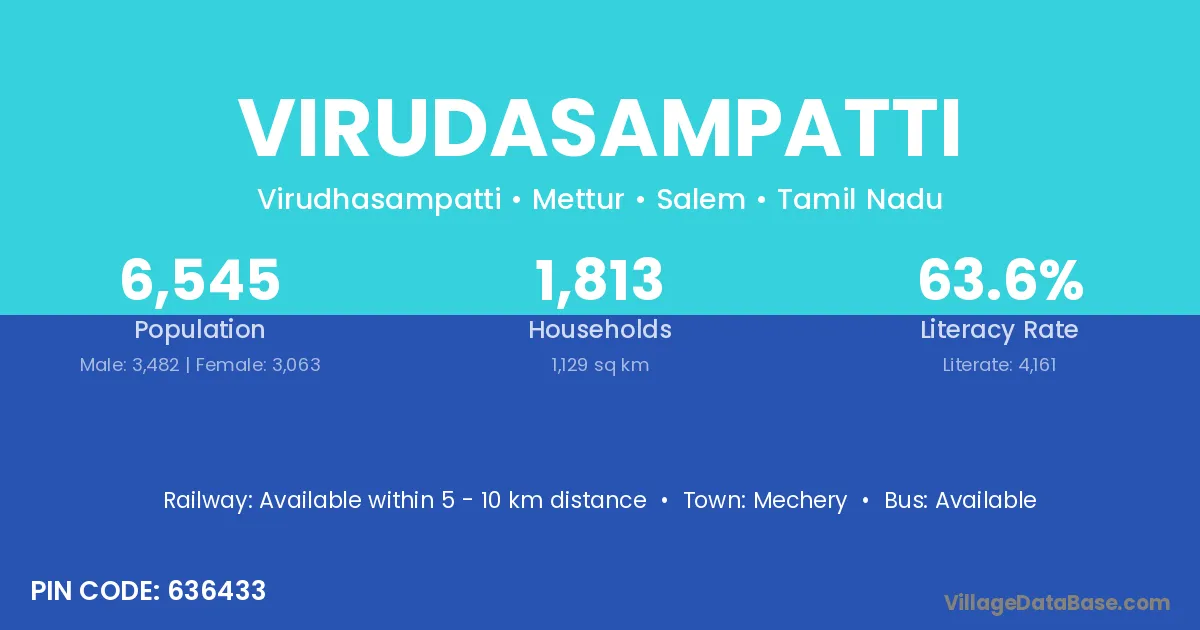 Virudasampatti village has a total population of 6,545 people, of which 3,482 are males and 3,063 are females.