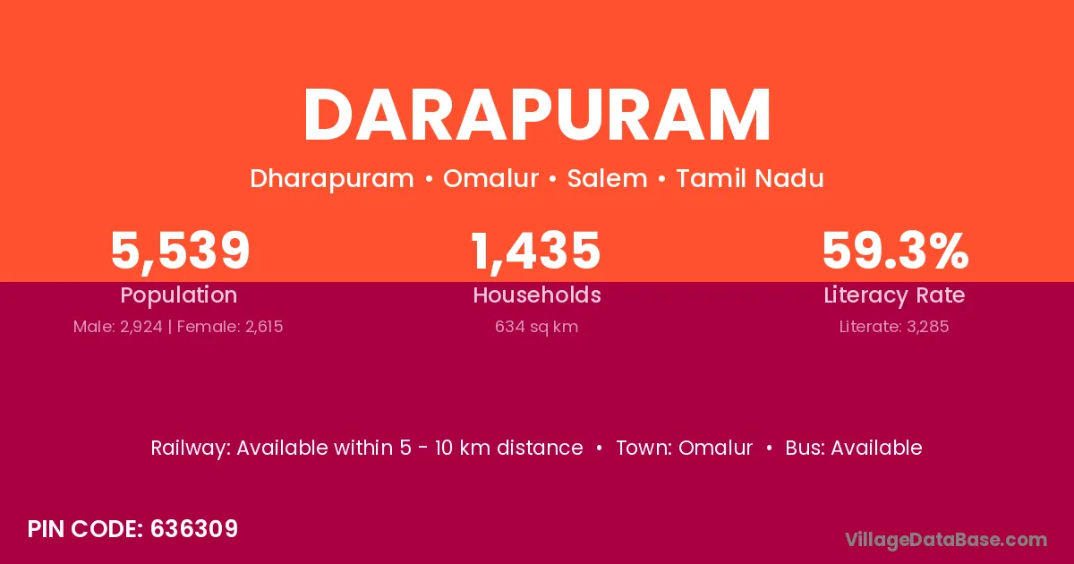 According to Census 2011 information, the village code of Darapuram village is 636309.