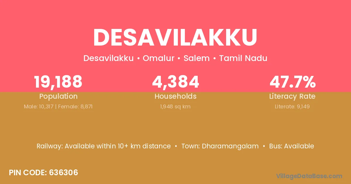 Desavilakku village has a total population of 19,188 people, of which 10,317 are males and 8,871 are females.