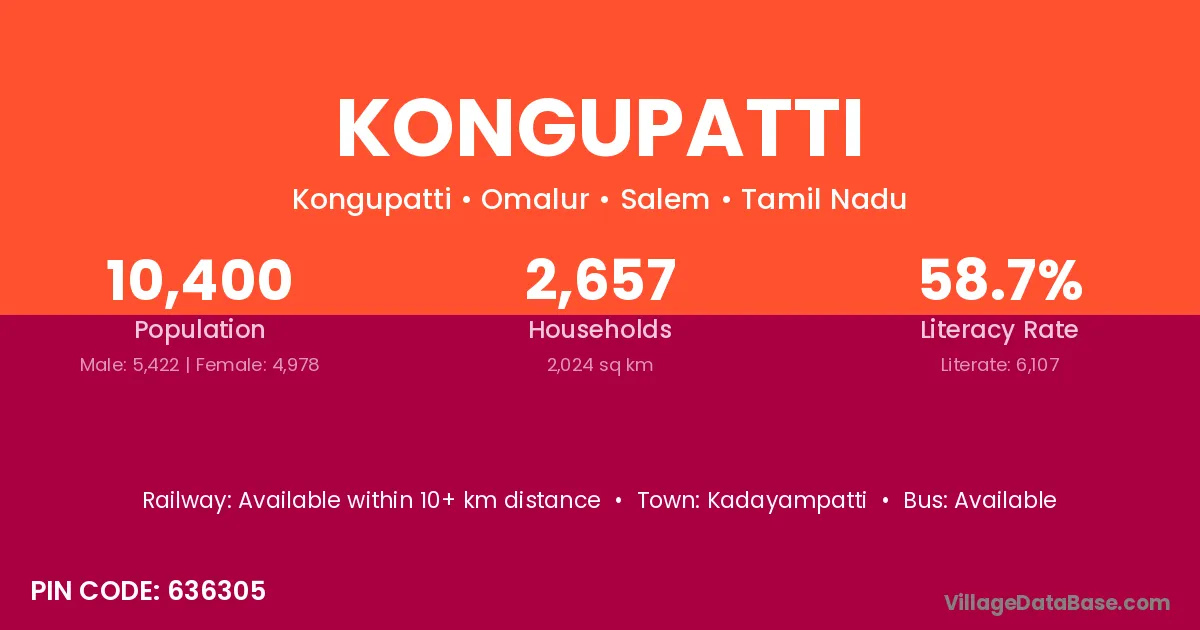 Kongupatti village has a total population of 10,400 people, of which 5,422 are males and 4,978 are females.