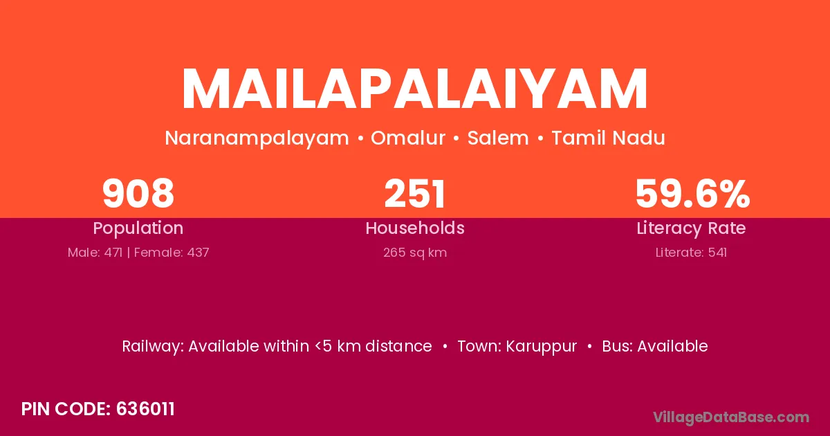 Mailapalaiyam village has a total population of 908 people, of which 471 are males and 437 are females.