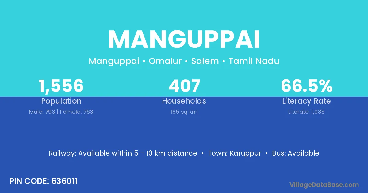 Karuppur is the nearest town to Manguppai village for major economic activities