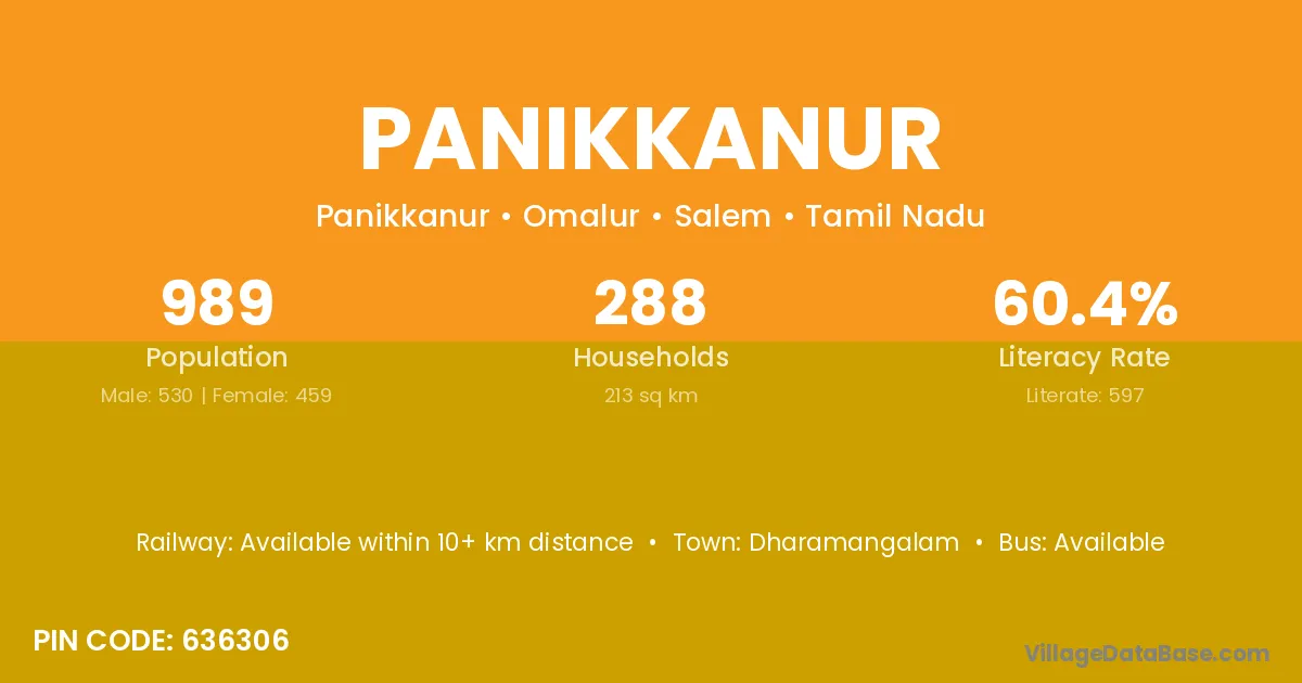Panikkanur village has a total population of 989 people, of which 530 are males and 459 are females.