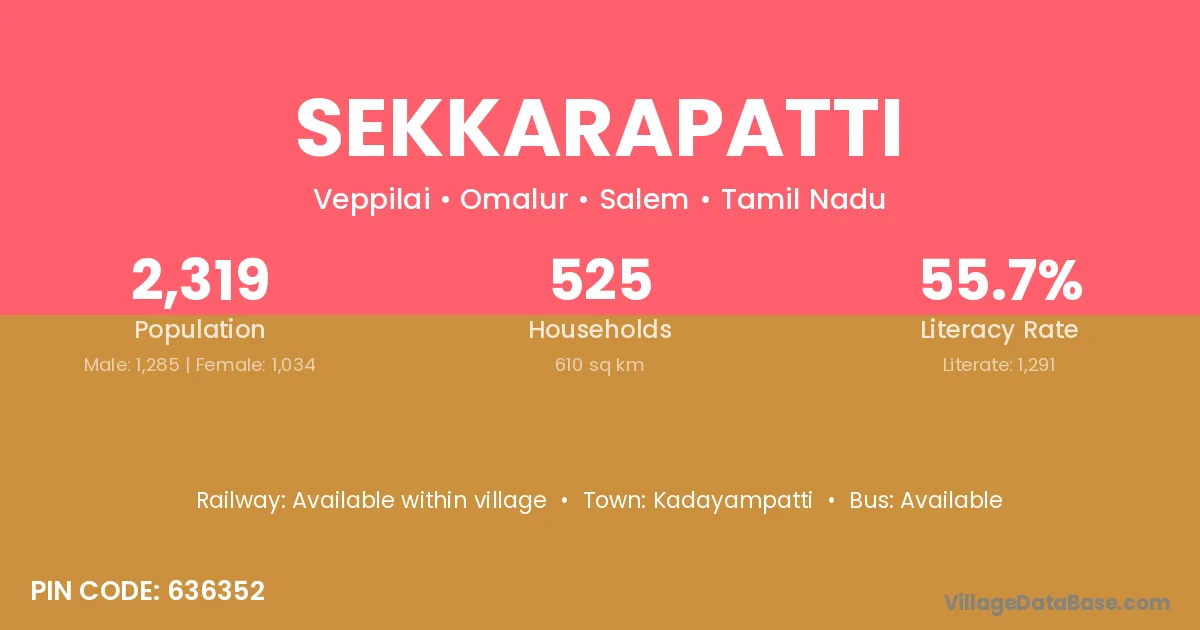 Sekkarapatti village has a total population of 2,319 people, of which 1,285 are males and 1,034 are females.