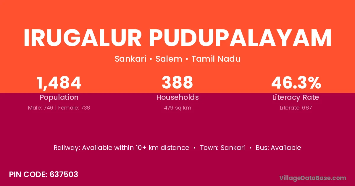 Irugalur Pudupalayam village has a total population of 1,484 people, of which 746 are males and 738 are females.
