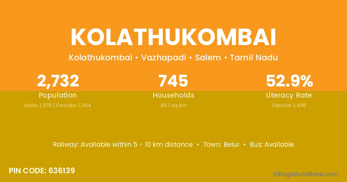 Kolathukombai village has a total population of 2,732 people, of which 1,378 are males and 1,354 are females.