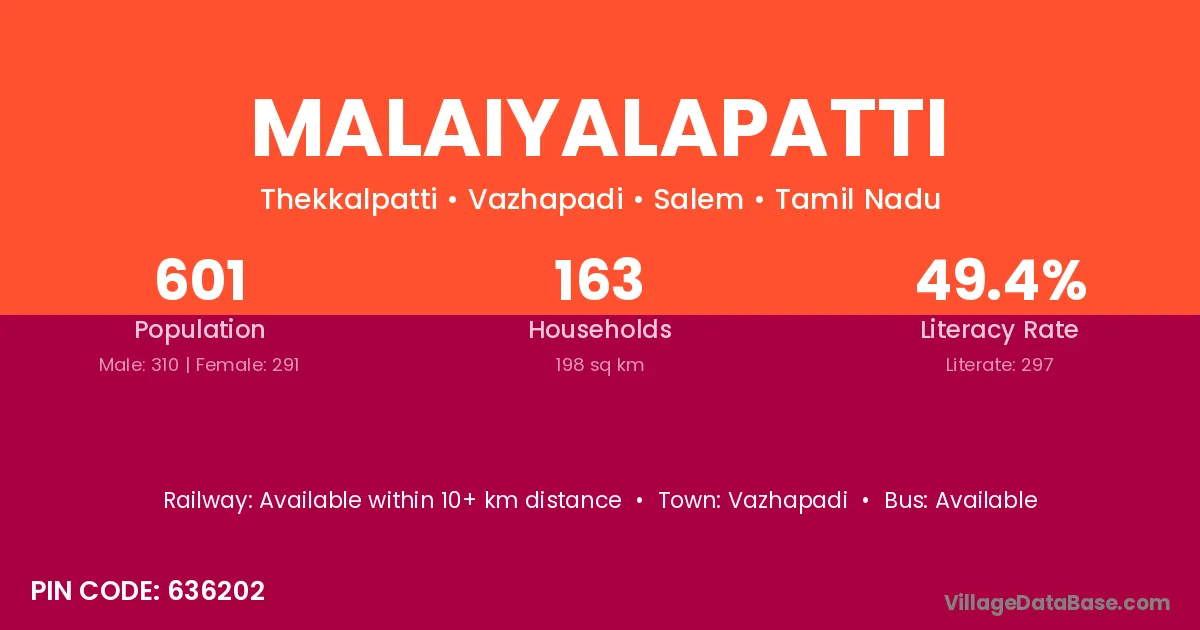 Malaiyalapatti village has a total population of 601 people, of which 310 are males and 291 are females.