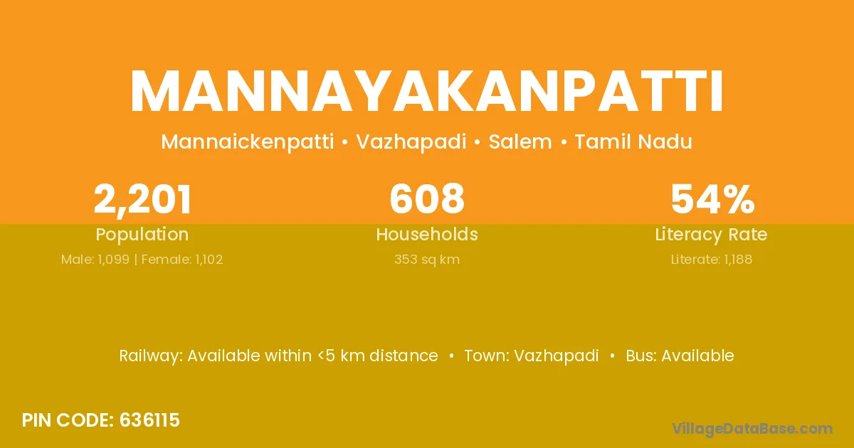 Mannayakanpatti village has a total population of 2,201 people, of which 1,099 are males and 1,102 are females.