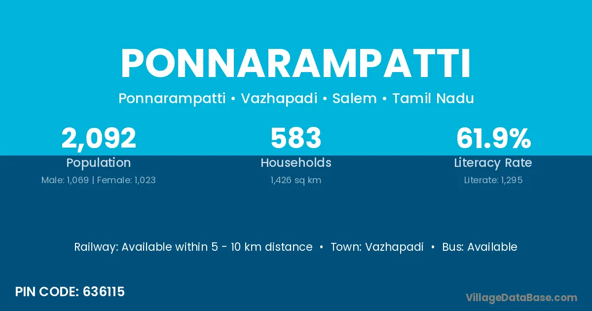 Ponnarampatti village has a total population of 2,092 people, of which 1,069 are males and 1,023 are females.