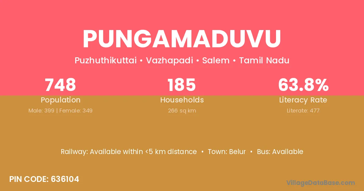 Pungamaduvu village has a total population of 748 people, of which 399 are males and 349 are females.