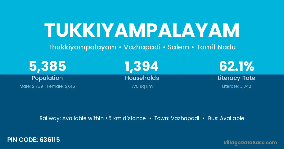 Vazhapadi is the nearest town to Tukkiyampalayam village for major economic activities