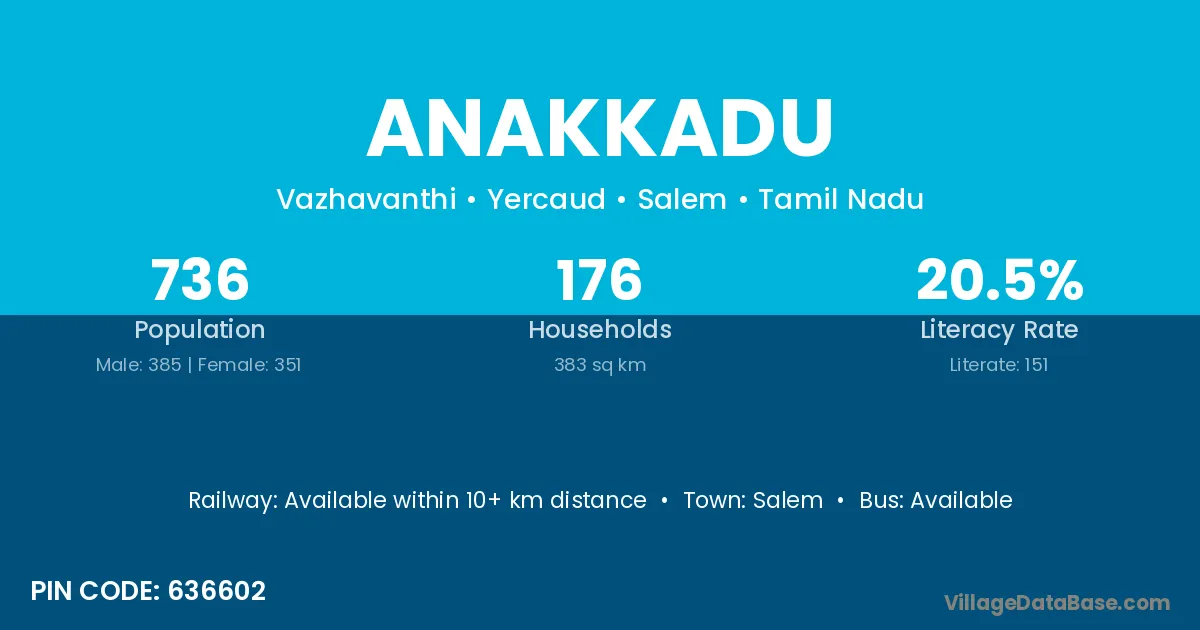Anakkadu village has a total population of 736 people, of which 385 are males and 351 are females.