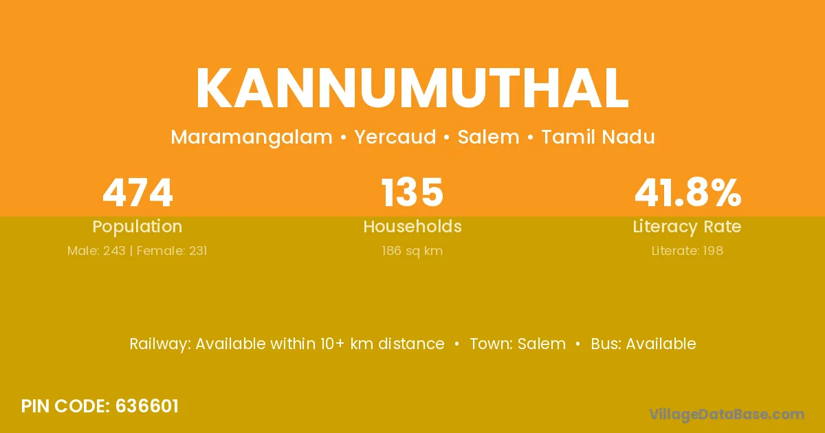 Kannumuthal village has a total population of 474 people, of which 243 are males and 231 are females.