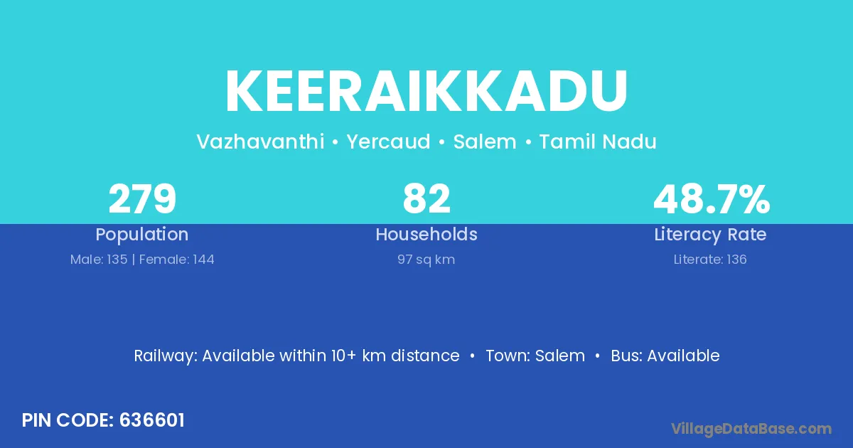Salem is the nearest town to Keeraikkadu village for major economic activities