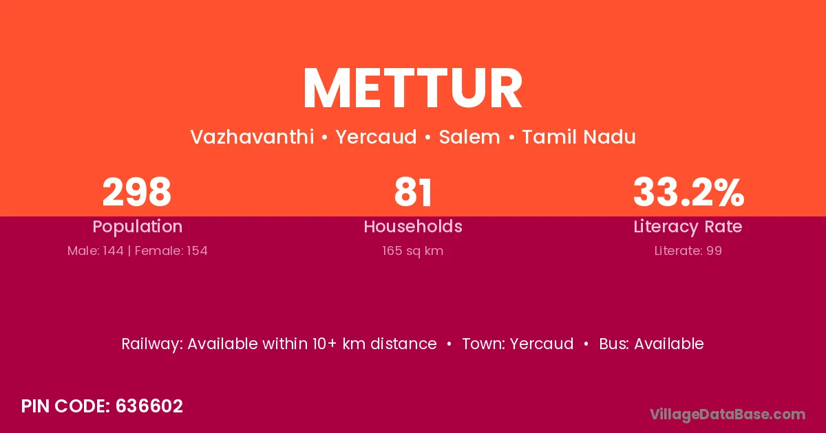 The literacy rate of Mettur village is 33.22%. Male literacy stands at 45.14% and female literacy at 22.08%.