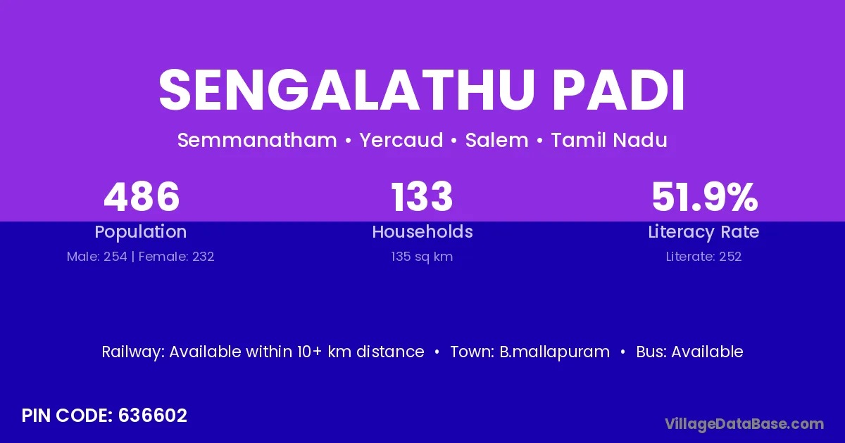 Sengalathu Padi village has a total population of 486 people, of which 254 are males and 232 are females.