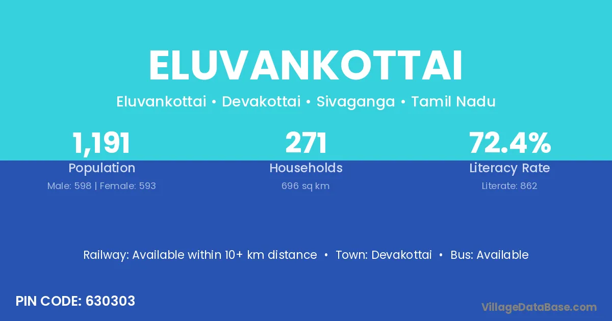 Eluvankottai village has a total population of 1,191 people, of which 598 are males and 593 are females.