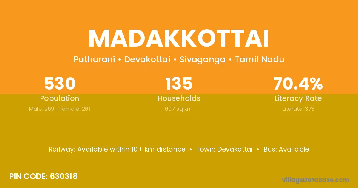 Madakkottai village has a total population of 530 people, of which 269 are males and 261 are females.