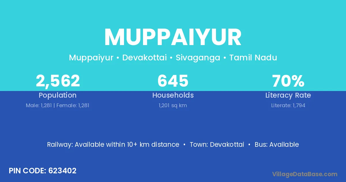 Muppaiyur village has a total population of 2,562 people, of which 1,281 are males and 1,281 are females.