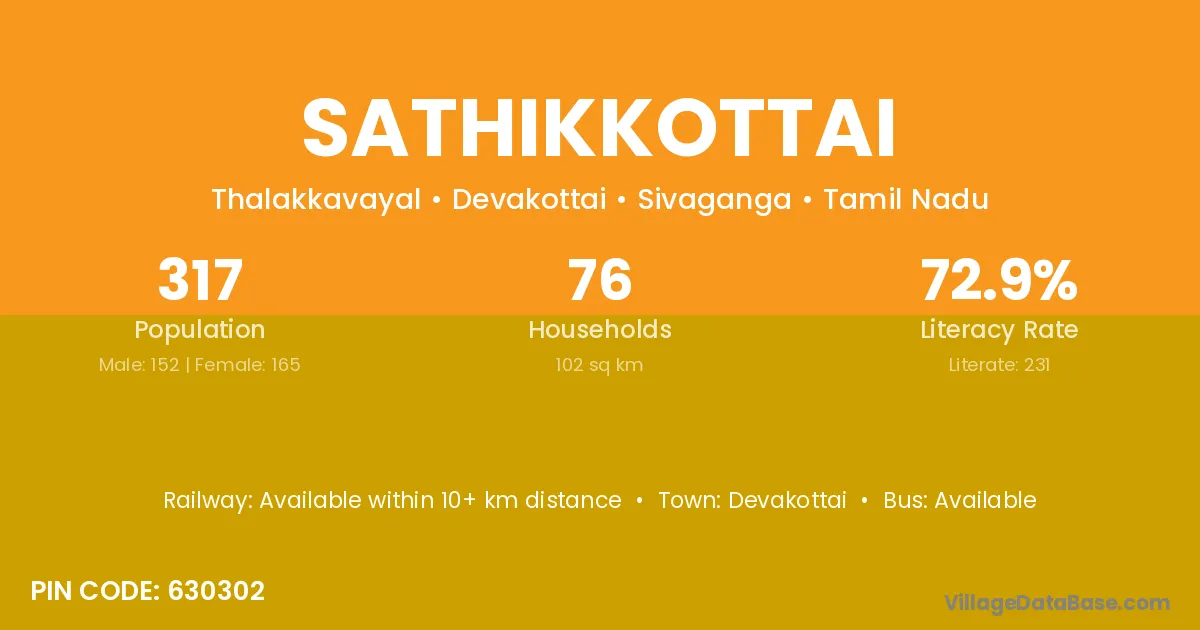 Sathikkottai village has a total population of 317 people, of which 152 are males and 165 are females.