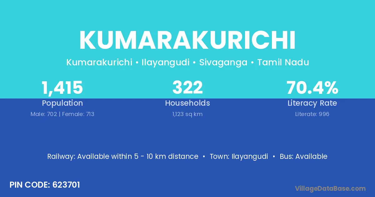 Kumarakurichi village has a total population of 1,415 people, of which 702 are males and 713 are females.