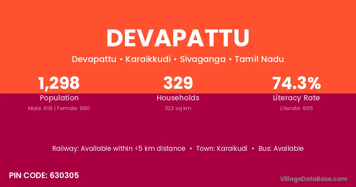 Devapattu village has a total population of 1,298 people, of which 618 are males and 680 are females.