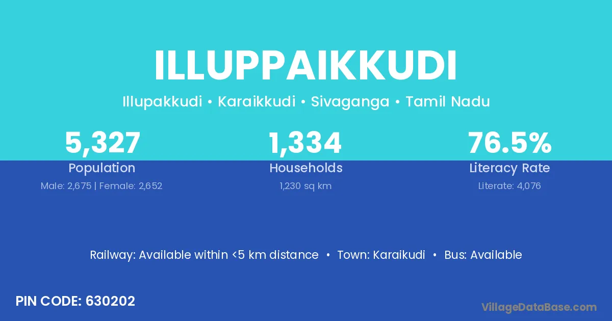 Illuppaikkudi village has a total population of 5,327 people, of which 2,675 are males and 2,652 are females.