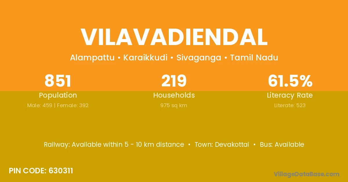 Devakottai is the nearest town to Vilavadiendal village for major economic activities