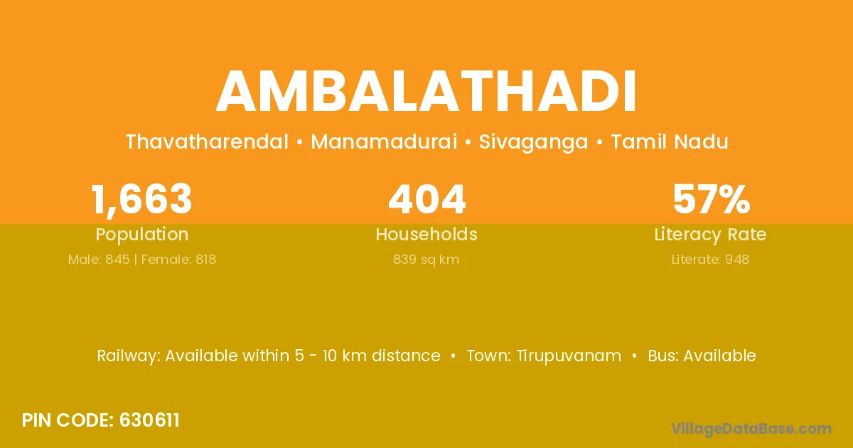 Ambalathadi village has a total population of 1,663 people, of which 845 are males and 818 are females.