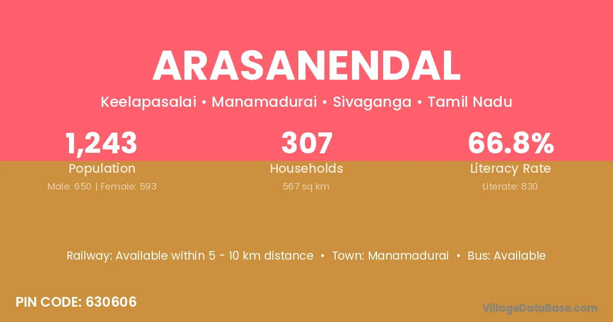 Arasanendal village has a total population of 1,243 people, of which 650 are males and 593 are females.