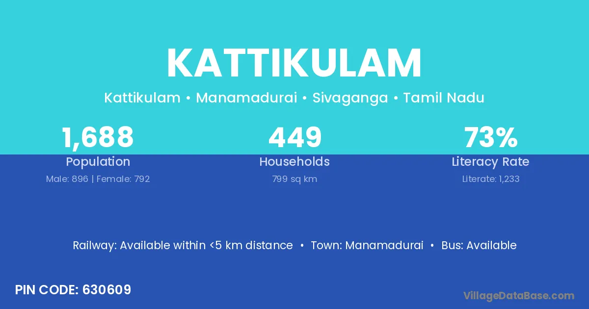 Kattikulam village has a total population of 1,688 people, of which 896 are males and 792 are females.