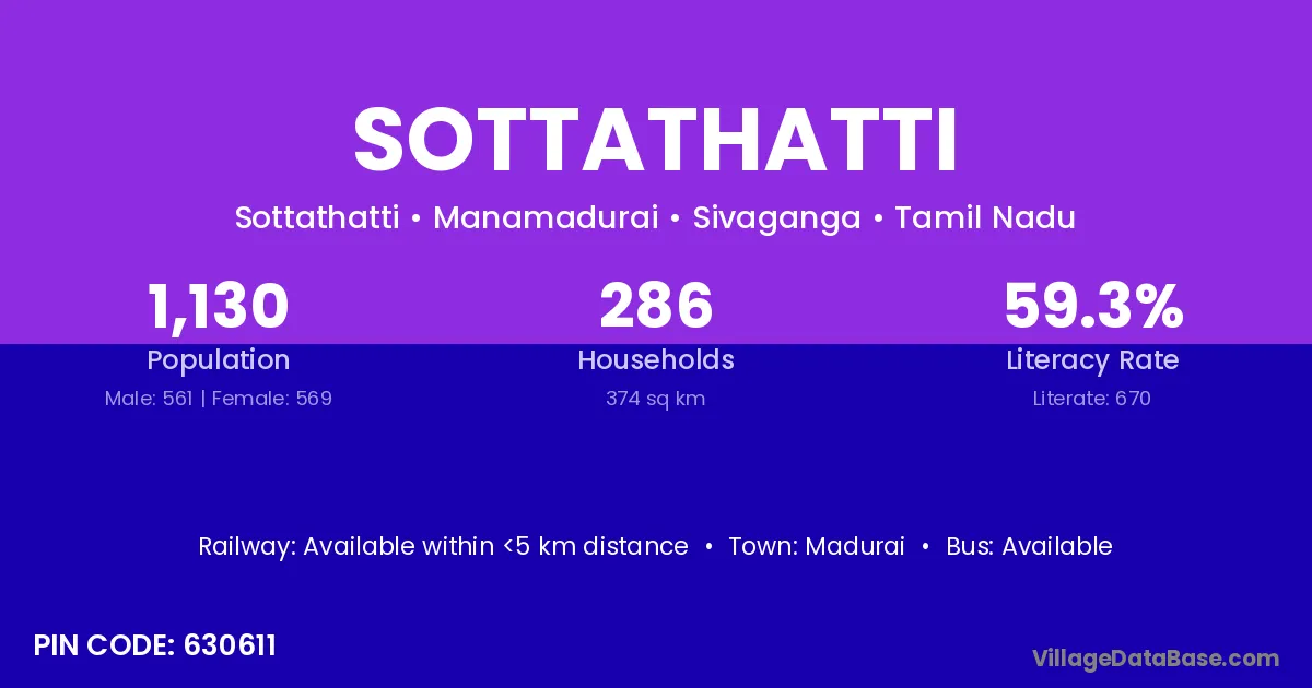 Sottathatti village has a total population of 1,130 people, of which 561 are males and 569 are females.