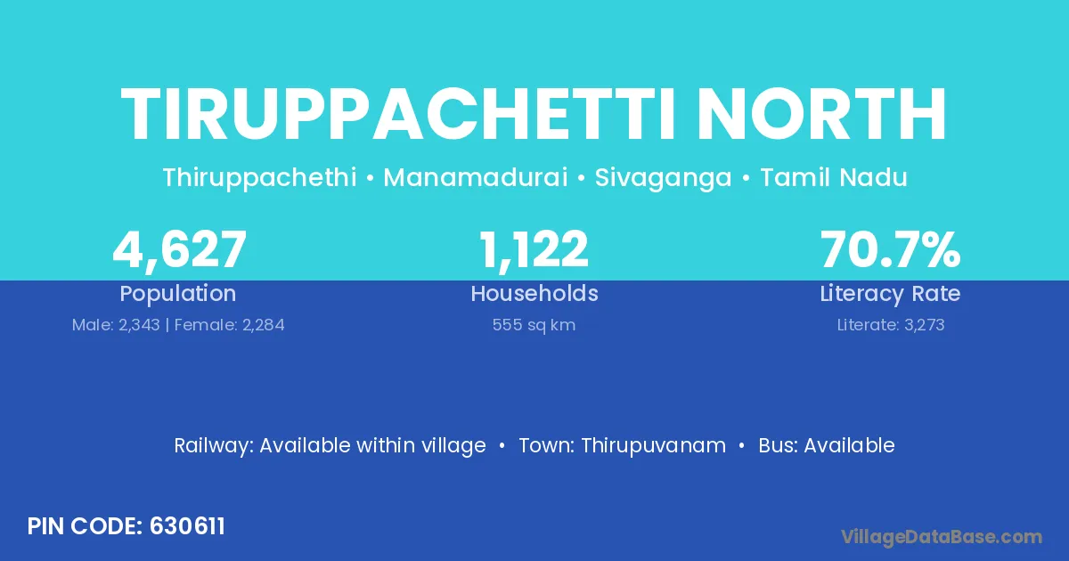 Tiruppachetti North village has a total population of 4,627 people, of which 2,343 are males and 2,284 are females.