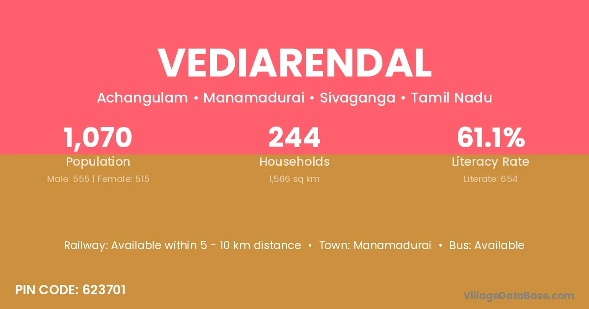 Vediarendal village has a total population of 1,070 people, of which 555 are males and 515 are females.