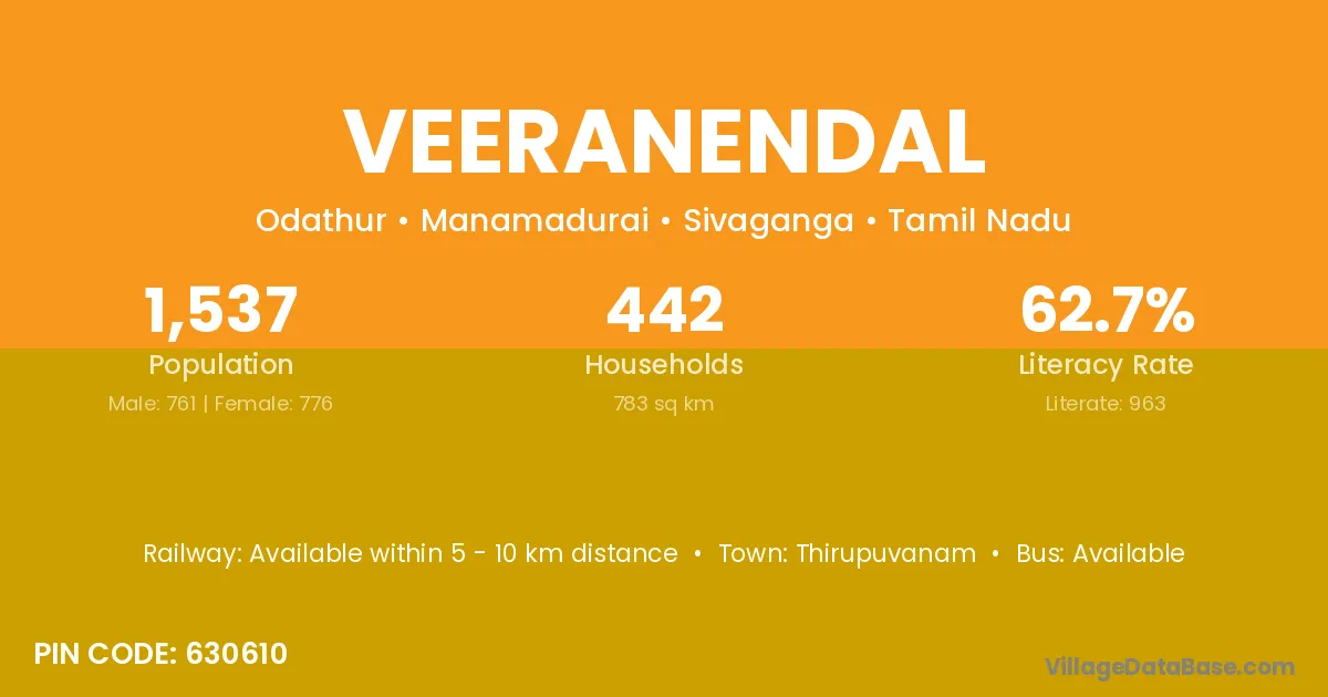According to Census 2011 information, the village code of Veeranendal village is 630610.