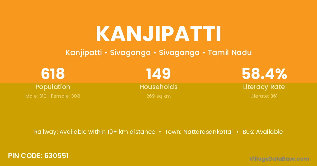 Kanjipatti village has a total population of 618 people, of which 310 are males and 308 are females.
