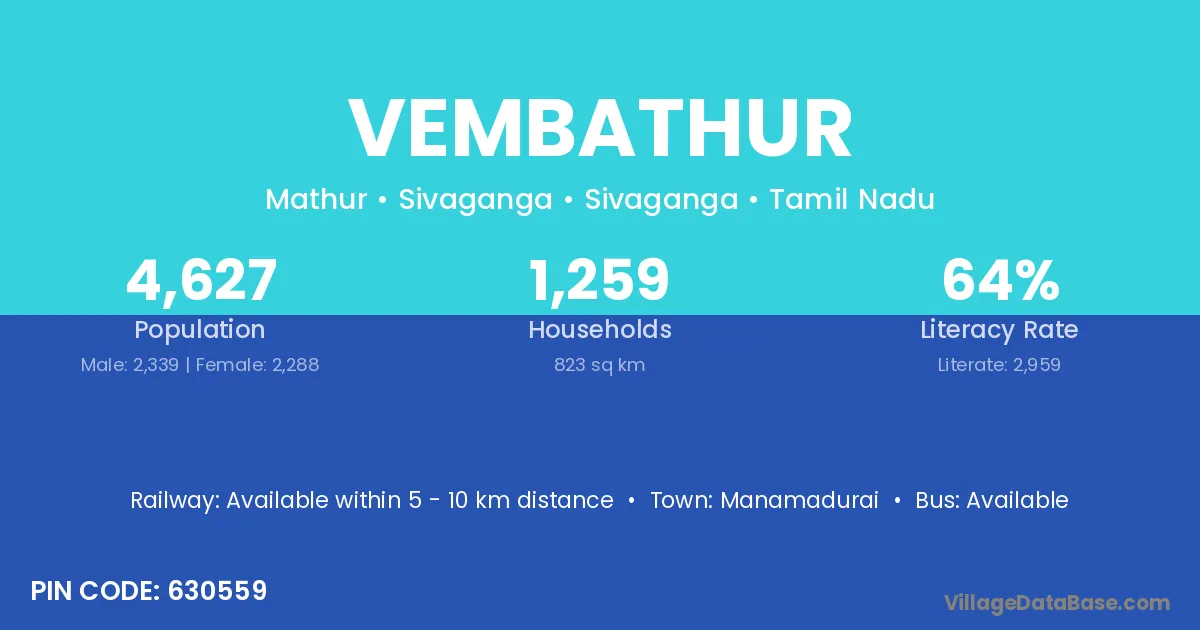 Manamadurai is the nearest town to Vembathur village for major economic activities