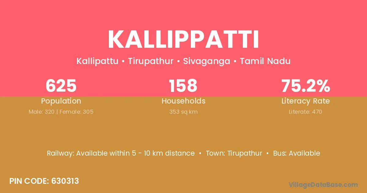 Kallippatti village has a total population of 625 people, of which 320 are males and 305 are females.