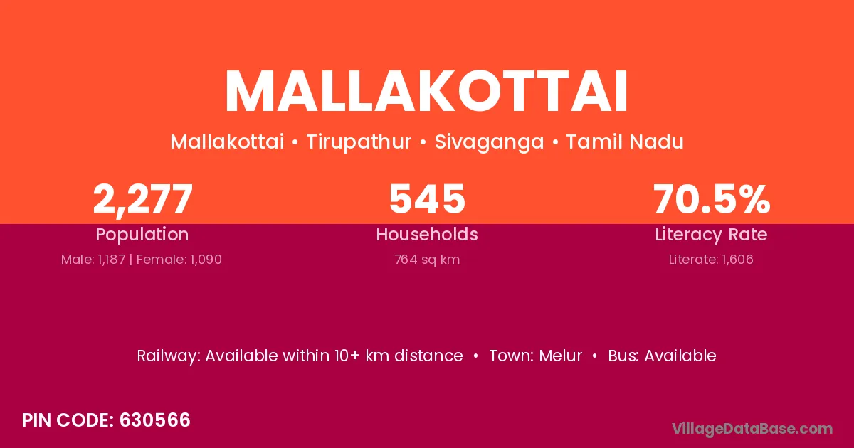 Mallakottai village has a total population of 2,277 people, of which 1,187 are males and 1,090 are females.