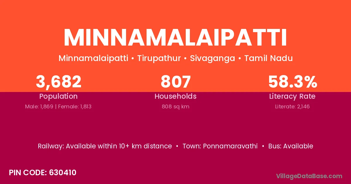 Minnamalaipatti village has a total population of 3,682 people, of which 1,869 are males and 1,813 are females.