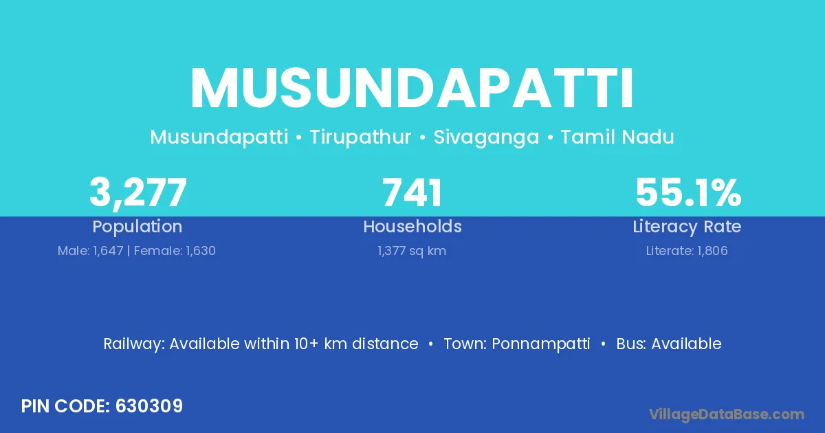 Musundapatti village has a total population of 3,277 people, of which 1,647 are males and 1,630 are females.