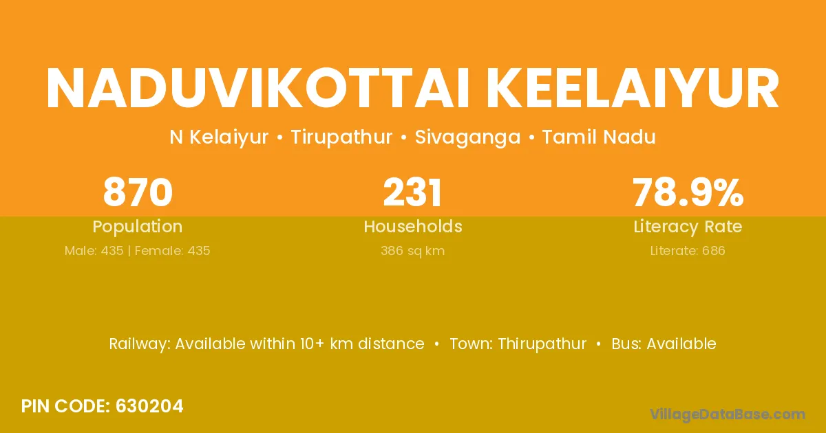 Naduvikottai Keelaiyur village has a total population of 870 people, of which 435 are males and 435 are females.