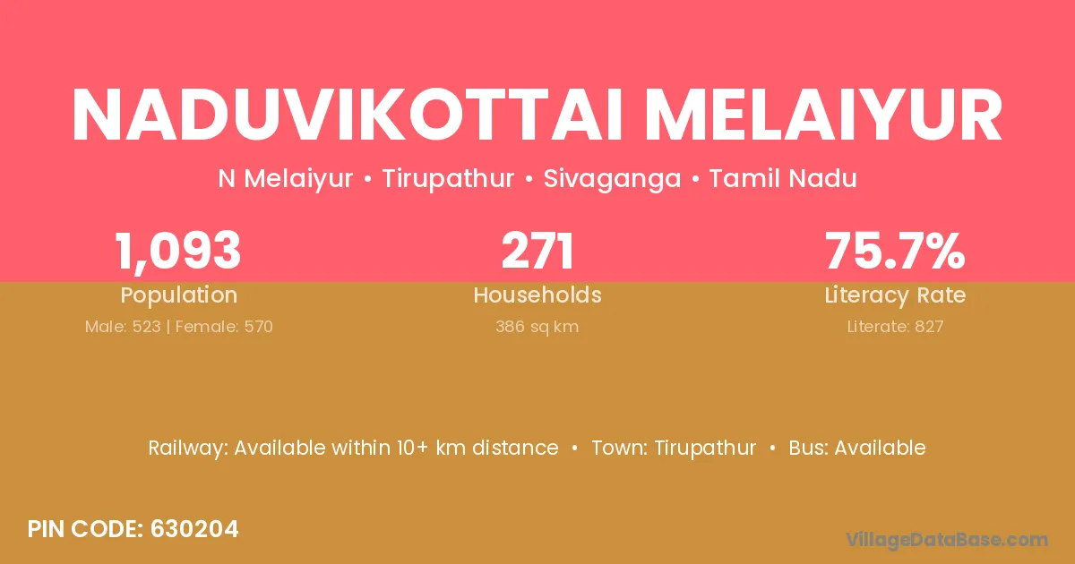 Naduvikottai Melaiyur village has a total population of 1,093 people, of which 523 are males and 570 are females.