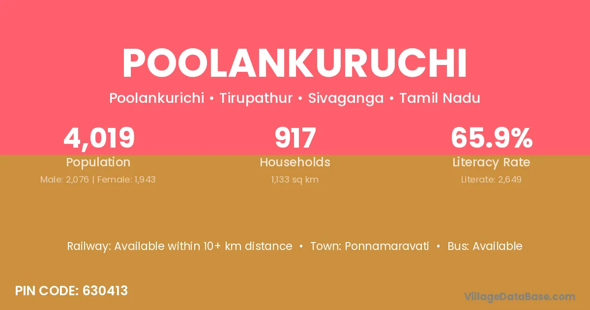 Poolankuruchi village has a total population of 4,019 people, of which 2,076 are males and 1,943 are females.