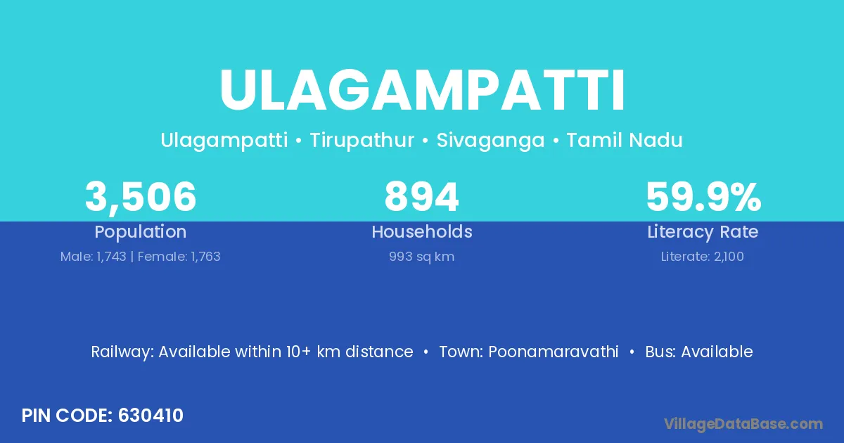 Ulagampatti village has a total population of 3,506 people, of which 1,743 are males and 1,763 are females.